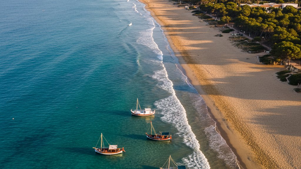 Talamanca is the beach we send almost every guest to on their first morning. It’s a generous 900-metre arc of fine sand tucked into a sheltered bay just north of the harbour. The water is calm, remarkably clear, and shallow enough to wade out for dozens of metres — perfect if you’re not the strongest swimmer or just want to float in peace.